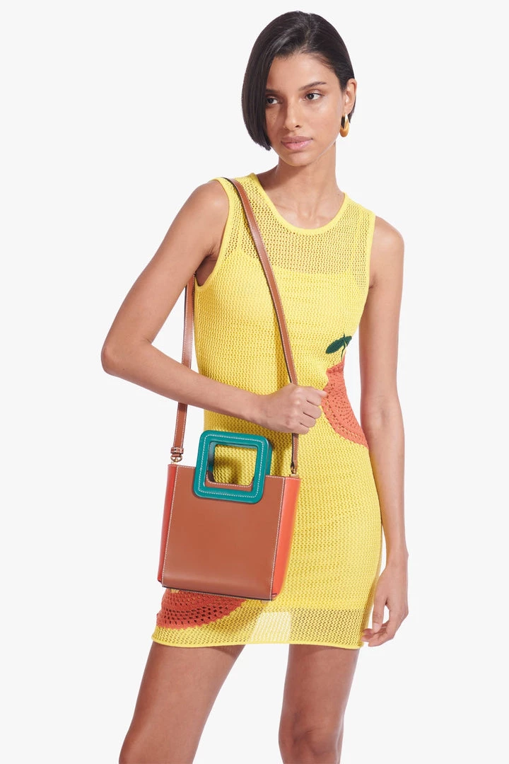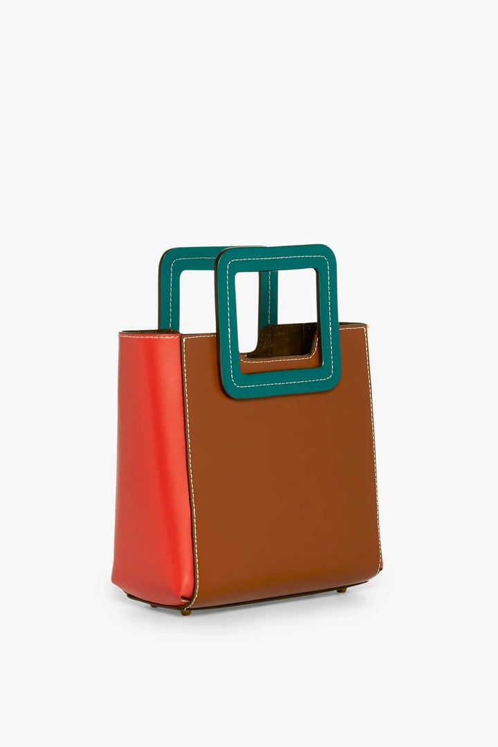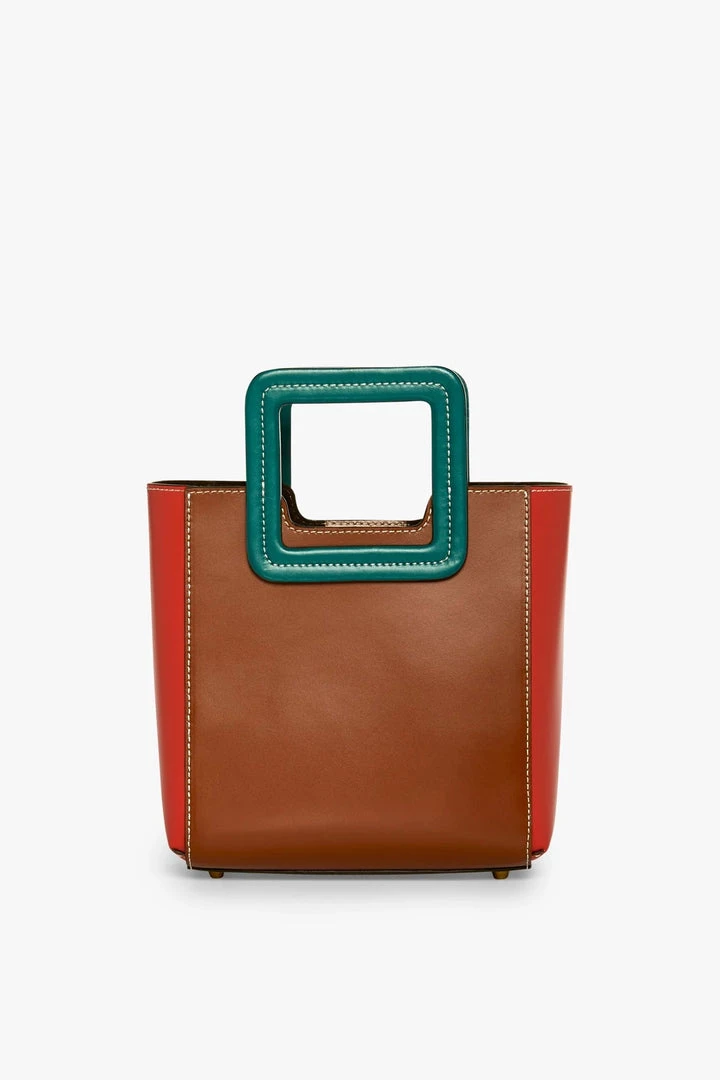 The Mini Shirley Bag in color-blocked leather. This style includes a removable matching inner zip pouch and adjustable leather shoulder strap.