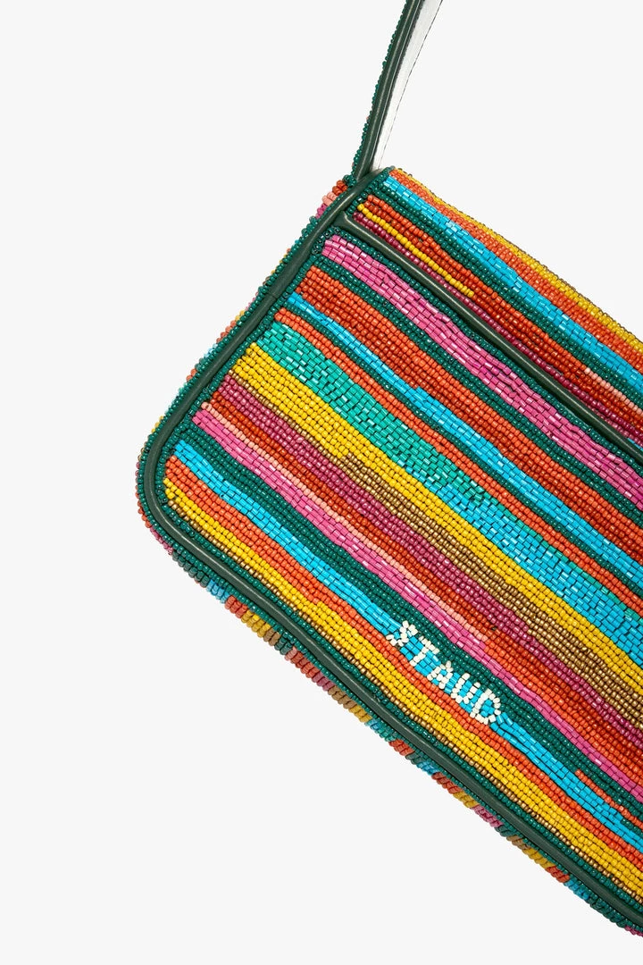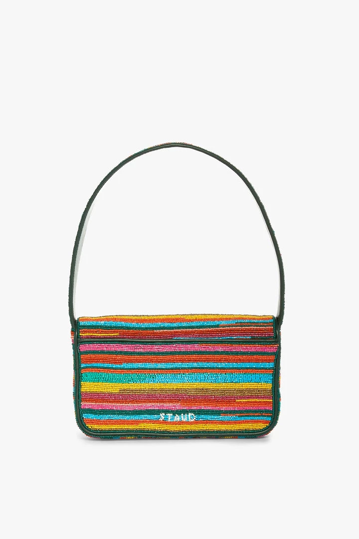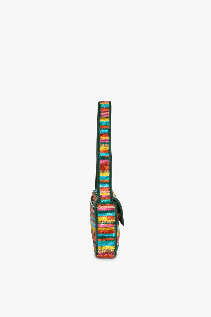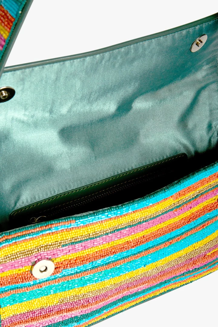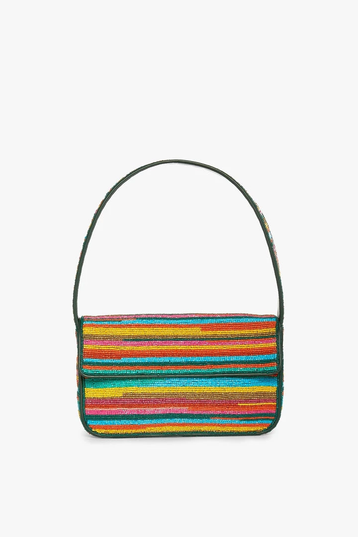 The Tommy Bag updated in a seasonal colorful stripe pattern. A hand-beaded shoulder bag with leather piping, this style features a single flap closure, inner zip pouch and magnetic pocket on the back.