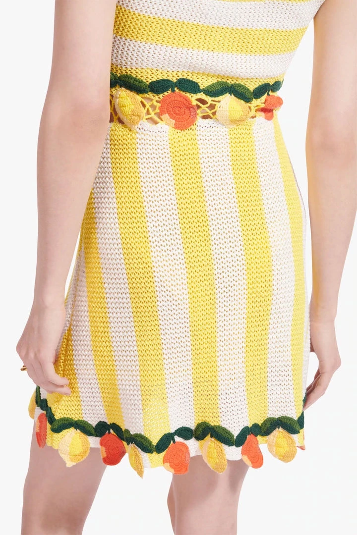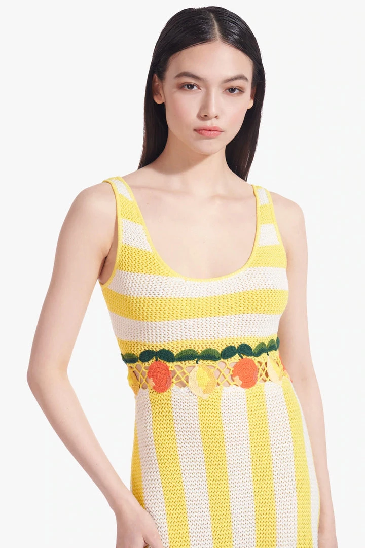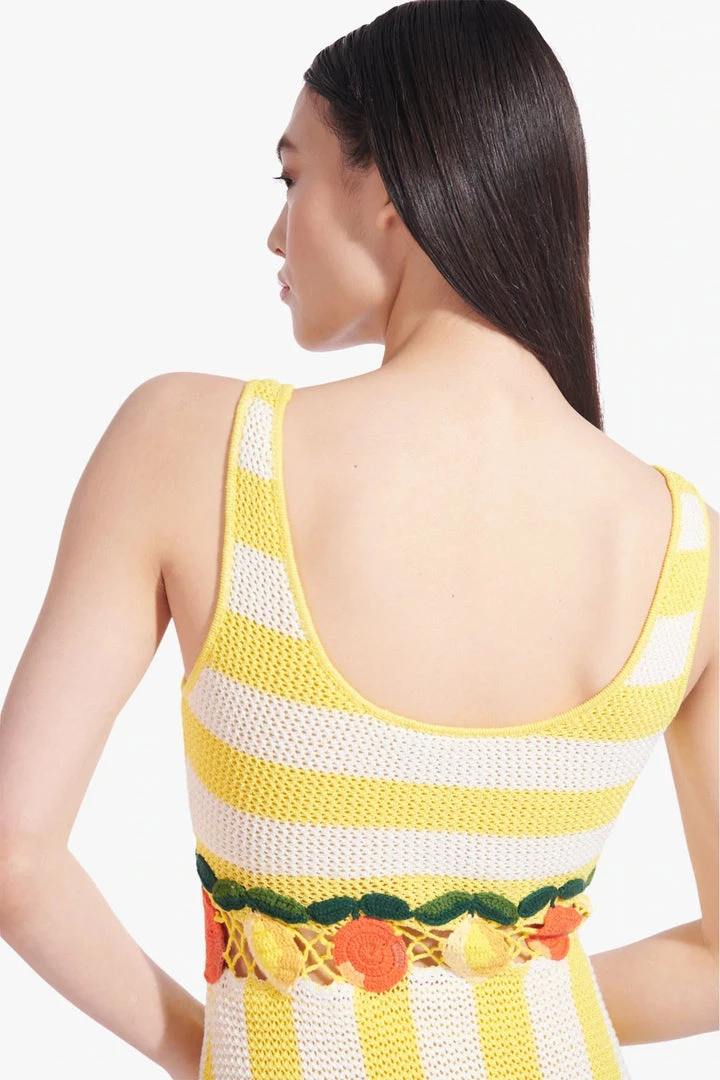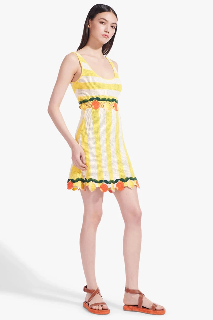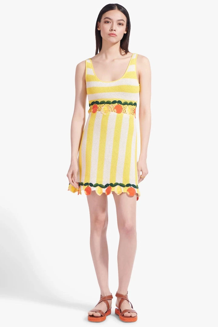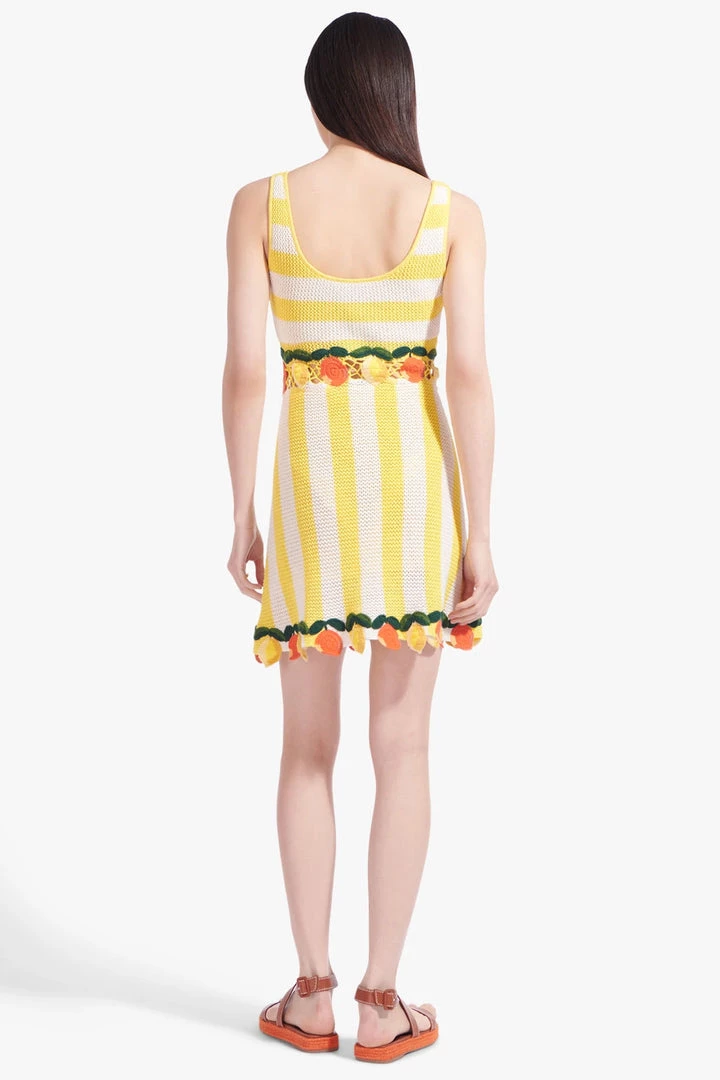A striped knit mini dress with orange and lemon crochet appliques. The Vivia Dress features a full coverage mesh lining and waist cutouts.