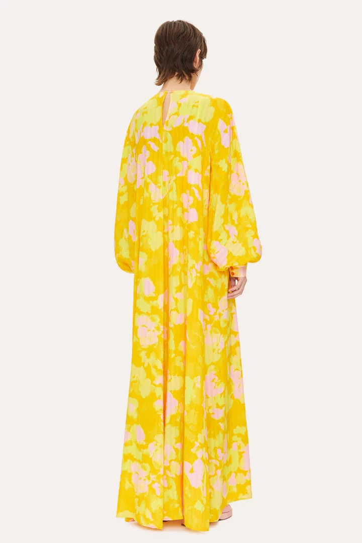 Tammy Dress in Tie Dye Pink Sunshine. Oversized flowing maxi dress with long puffed sleeves, cinchable waist and all over abstract pattern. Including slip dress.