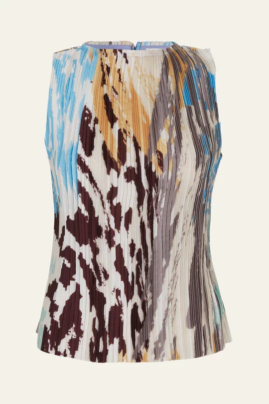 Edith Top in Multi Cheetah. High collared sleeveless top with elegant pleating and elegant animal print pattern. 100% Recycled Polyester. Pair with the Bon Skirt in Multi Cheetah.