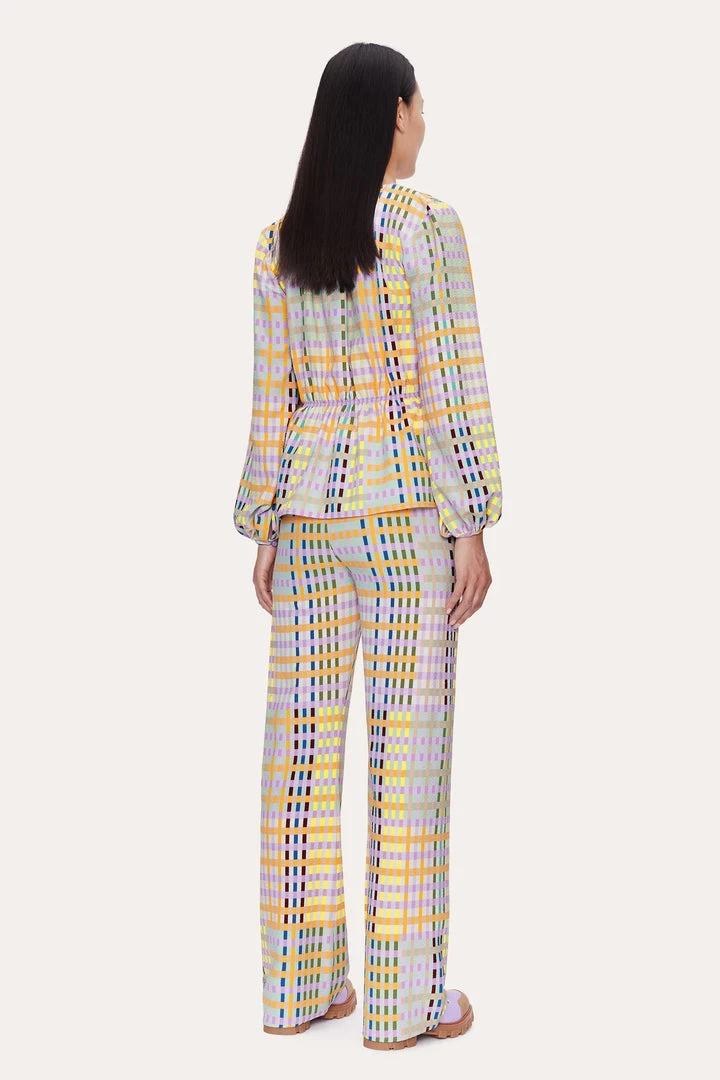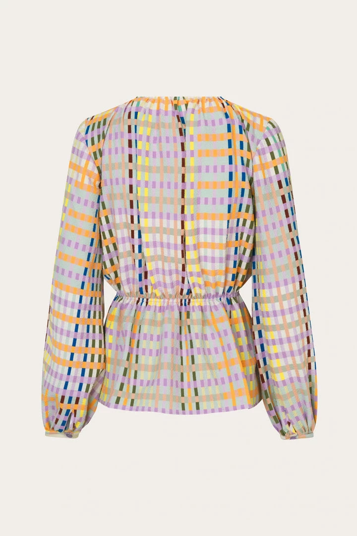 Karin Blouse in Techno Check. Elegant flowy peplum blouse with puffed long sleeves, closeable v-neck and an elasticated waist. Made of a Recycled Polyester blend. Pair with the Marc Pants in Techno Check.