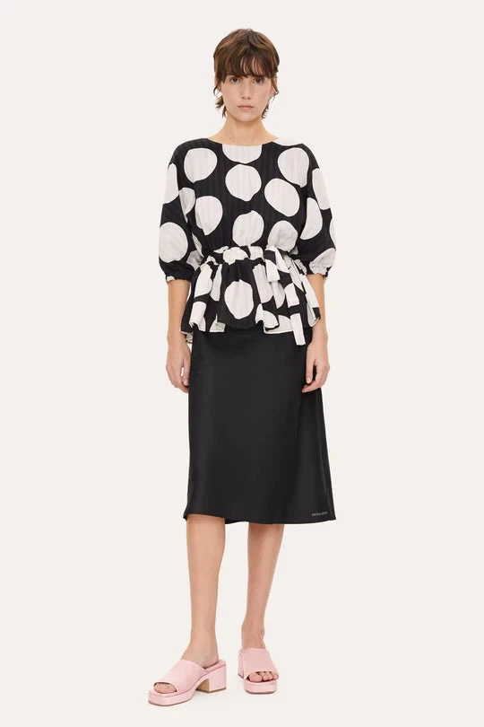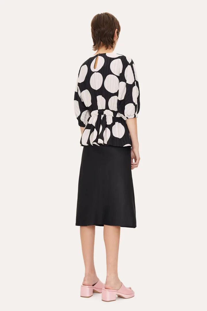 Louisa Blouse in Solar Eclipse. Classic peplum top with airy pleated material, puffed sleeves and subtle cinched waist with bow detail. Layer over the Holly Slip Dress in Black.