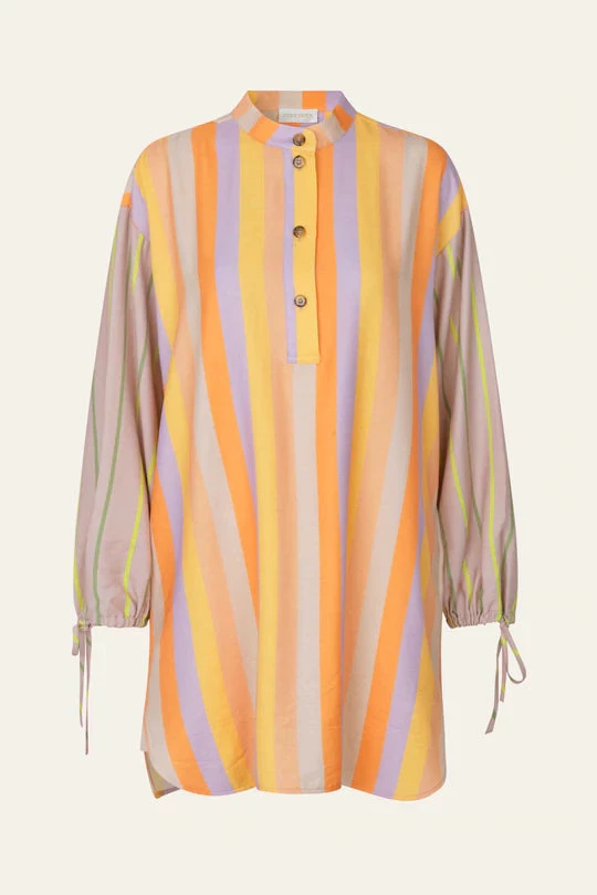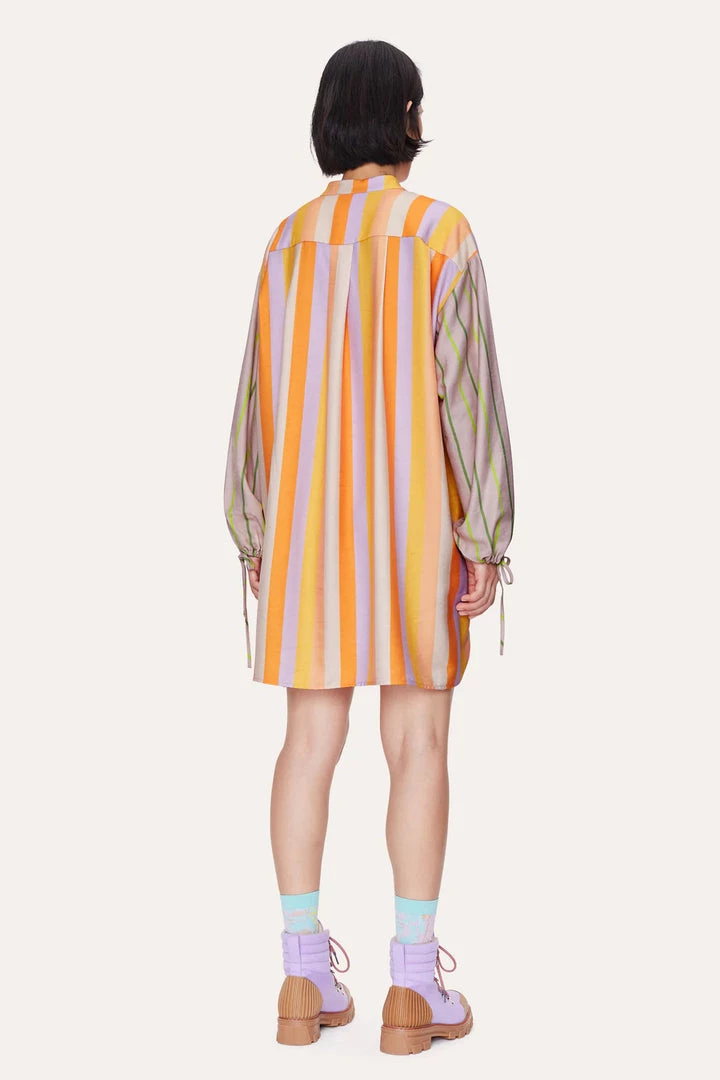 Neva Dress in Sunset and Lime Stripe. Relaxed 1/4 length button up shirt dress. Puffed long sleeves with drawstring cuffs. Hidden side pockets. Pair with your favourite shoes from the collection.
