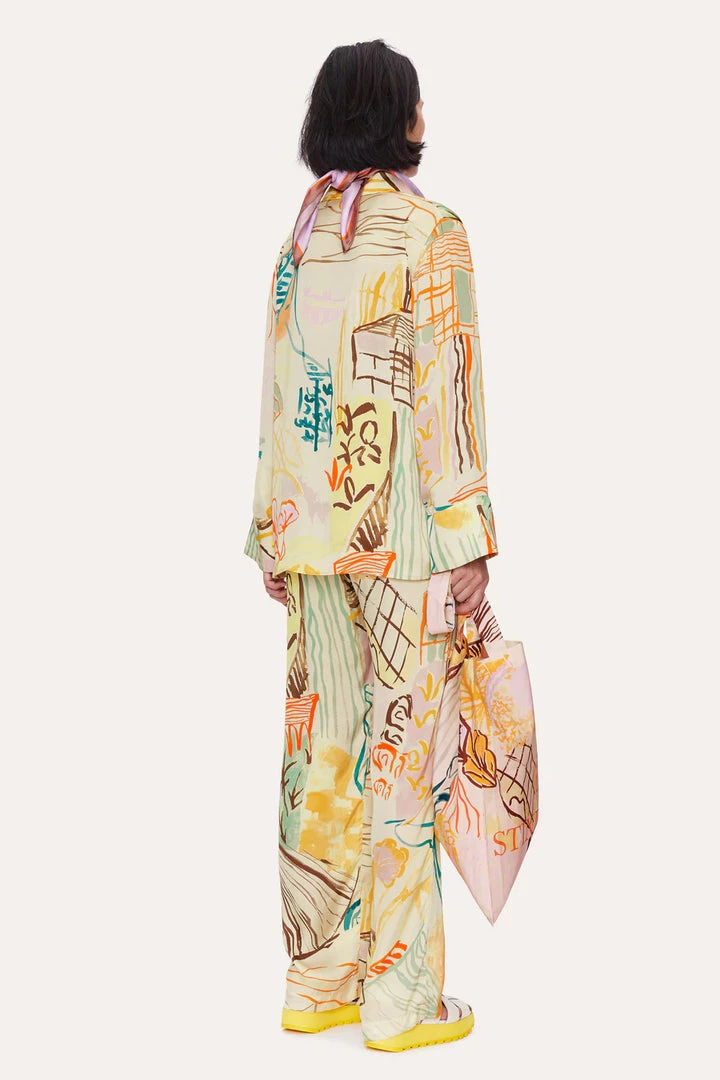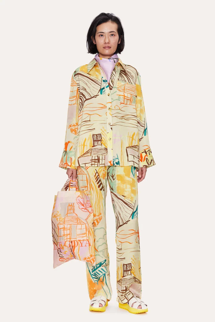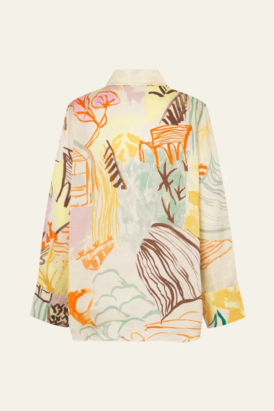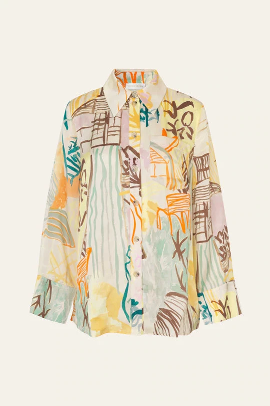 Summer Shirt in Charleston House. Relaxed button up blouse with collar and chest pocket. Wide long cuffed sleeves. Intricate all over pattern. Pair with the Fatou Pants in Charleston House and the Vaian Sandals in White.