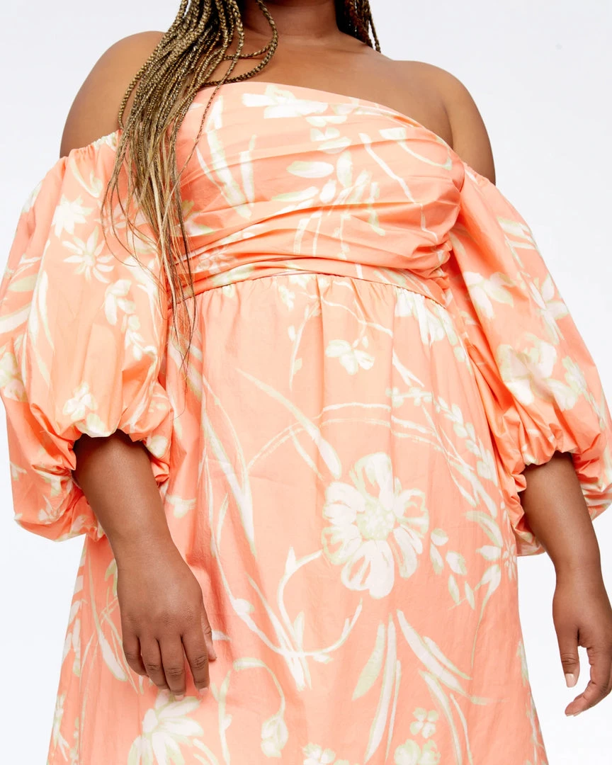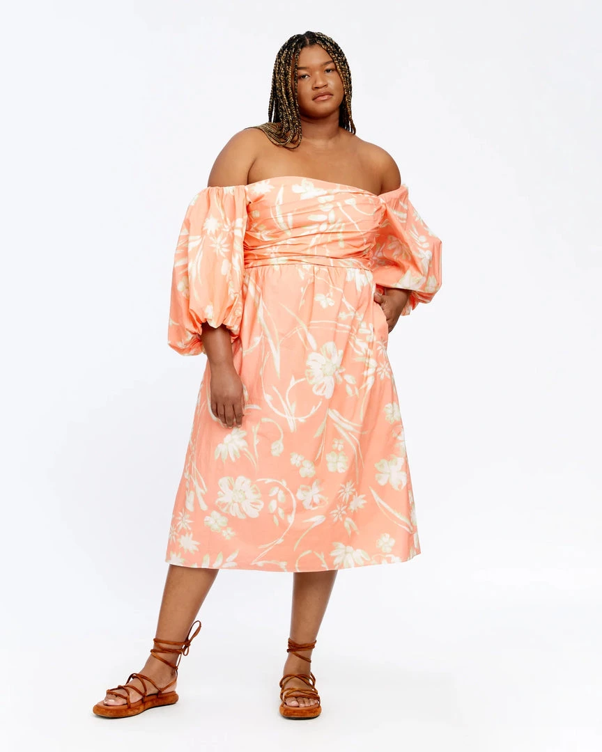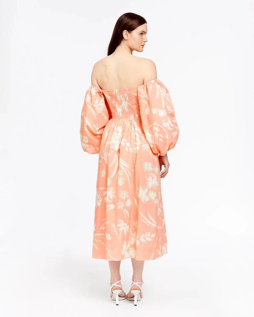 Designed in a sandwashed cotton for richness of texture, Alora is an elevated off-the-shoulder dress in our papaya Bleach Floral print.