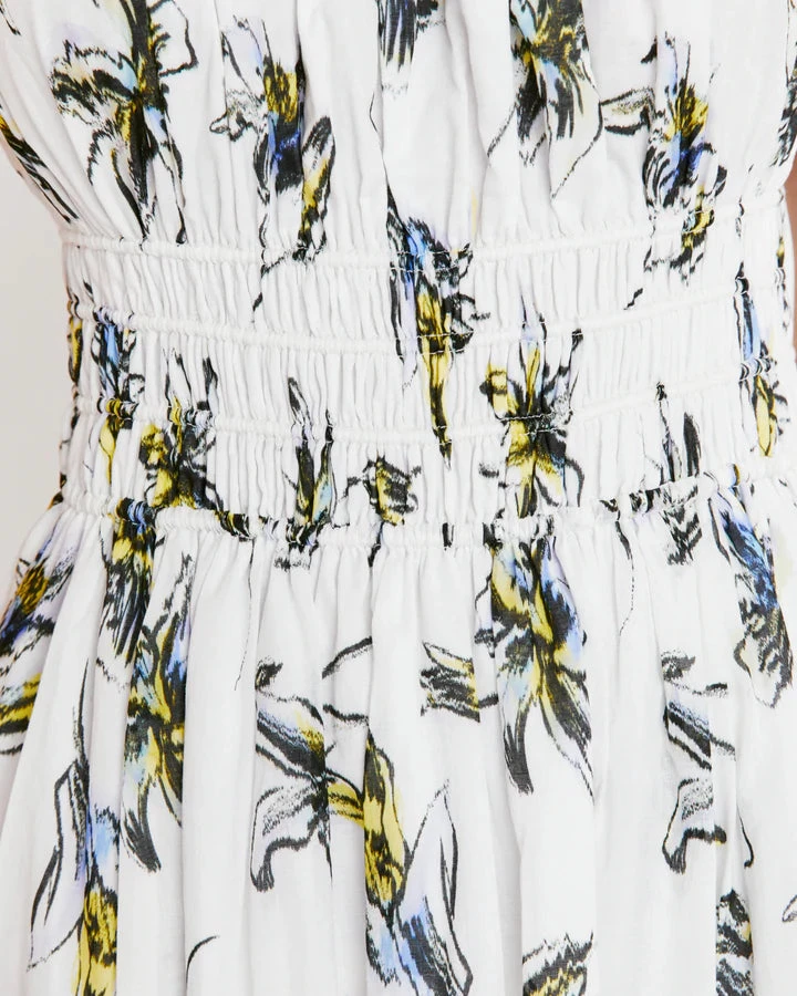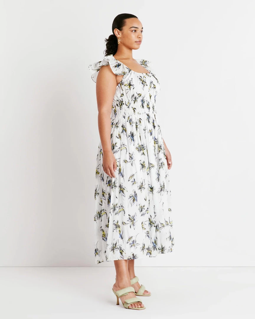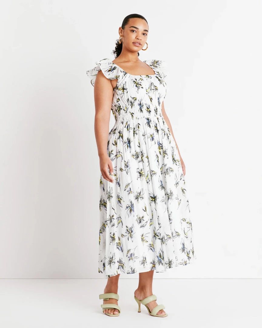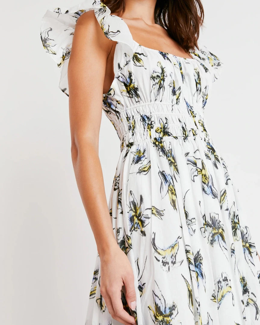 Featuring elasticity at the waist, a scooped neckline and flutter sleeves, Jessica is an effortless answer to daytime dressing. Jessica is shown here in our hand-painted Warped Lily print.