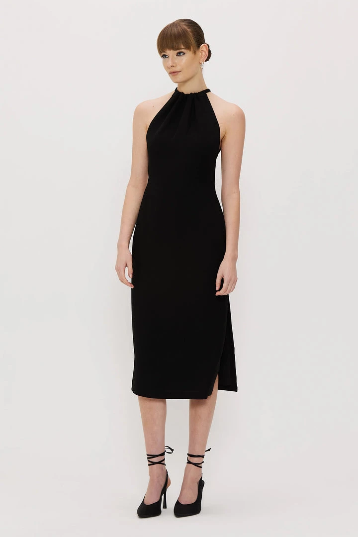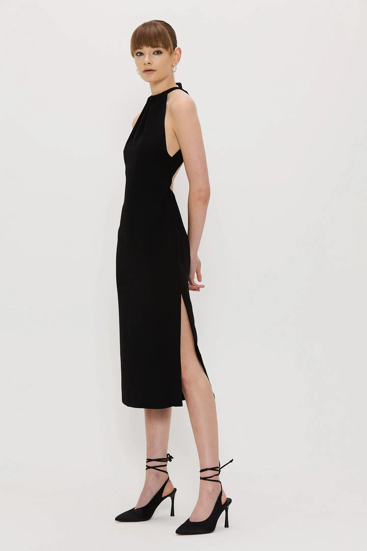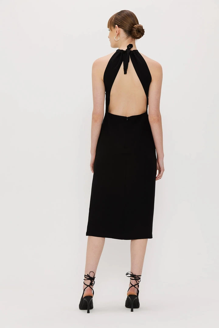 The Come Closer Midi Dress is the epitome of chic. This piece features an elegant drawn in, raised front neck, designed with a delicate back neck tie – making for a striking silhouette. The column-shaped style finishes mid-calf, balancing the lowered back and cutaway sides. Style with a classic pump or heeled boot for an elevated look.