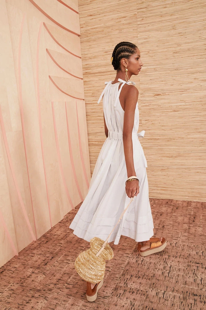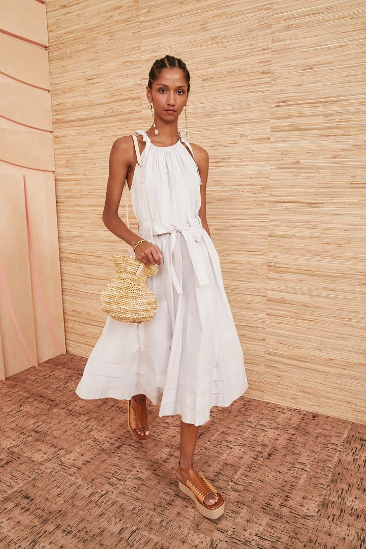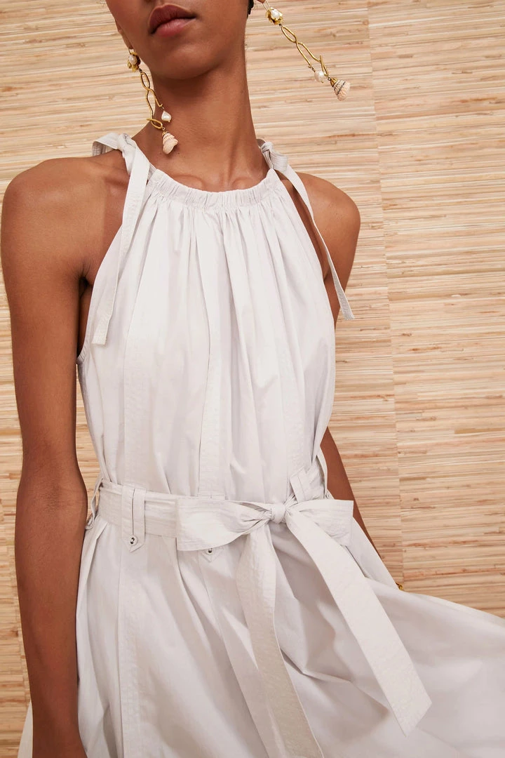 The sleeveless Joni Dress returns in our softly washed Dove cotton poplin. Features a layered midi length skirt, halter neckline with bow detailing and adjustable waist with removable belt. Rows of tiny trapunto top stitching create texture throughout and allow for subtle volume down the skirt. This dress has pockets and is unlined.