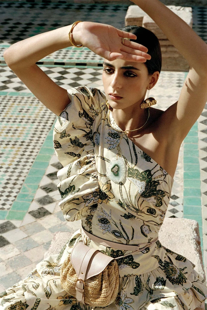 The Ondine one-shoulder dress is a season-favorite. Cut in pale yellow printed cotton poplin, this dress has a draped bodice that follows the contour of the body with a cascading ruffle down one side and into the skirt. Layered tiers add a lightness and sense of movement enhancing this midi-length party dress.