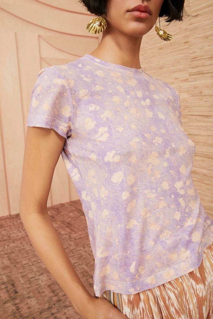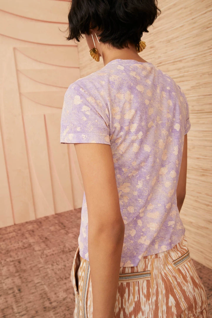 The Estelle T-Shirt expands our printed underpinnings offering, cut in soft cotton fabric and patterned in lavender handprint dots. This short sleeve top is meant to fit close to the body, designed with a simple crewneck and fitted sleeves.