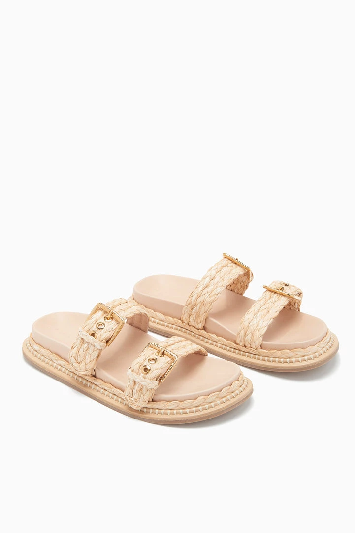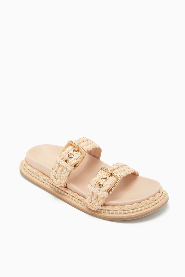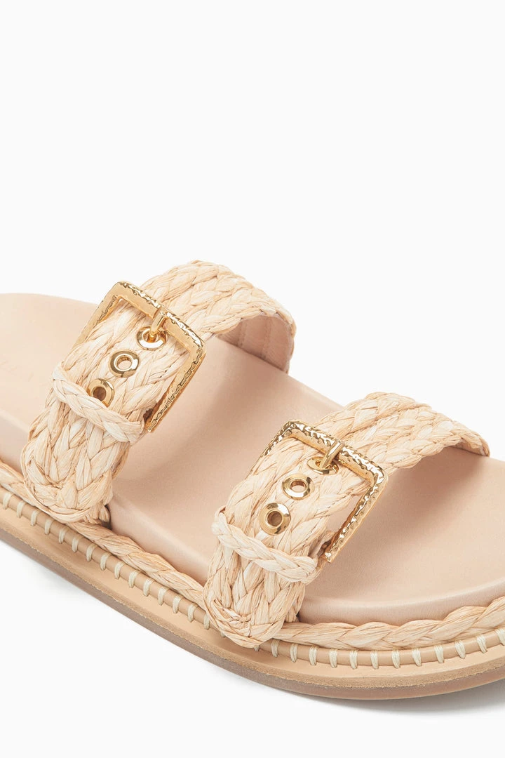 | The Kiera Raffia Slide is crafted from natural raffia, our signature slide reimagined with comfortable adjustable foot straps and a smooth nappa leather footbed. Pair these with everything from a printed dress to denim shorts. |