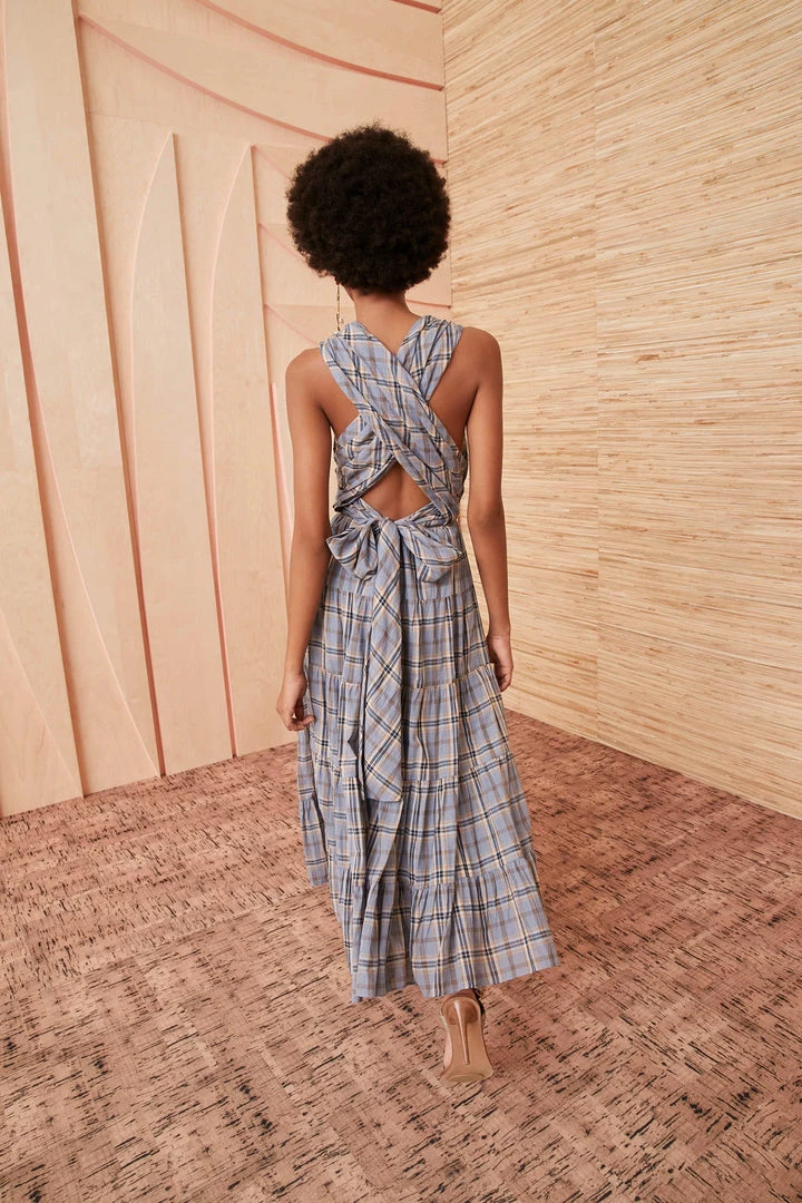 | The Noelle Dress is printed in a light blue plaid madras pattern that is timeless and optimistic, just like the silhouette. The feminine shape features a criss-cross bodice with a tiny keyhole opening at its base. There is a fixed waist and a floaty, tiered hem that moves beautifully when walking.  Composition: 100% Cotton. Lining: 100% Cotton. |