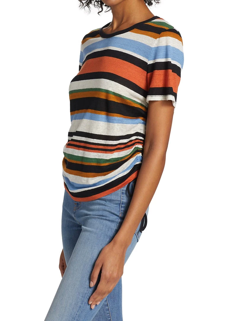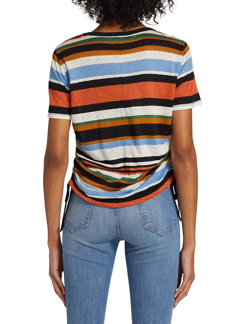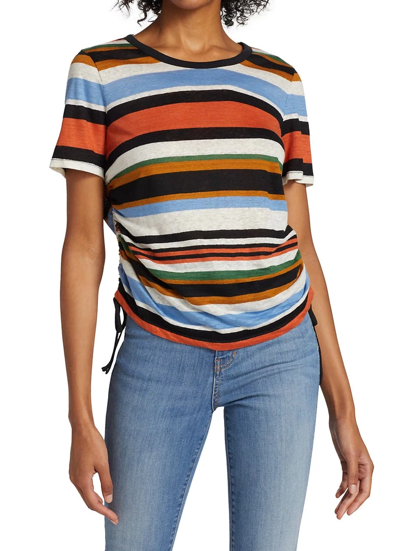 Veronica Beard’s Tazi T-shirt is crafted of linen. Decorated with horizontal stripes, this classic style has been reimagined with adjustable drawstring sides for an ultra-flattering fit.