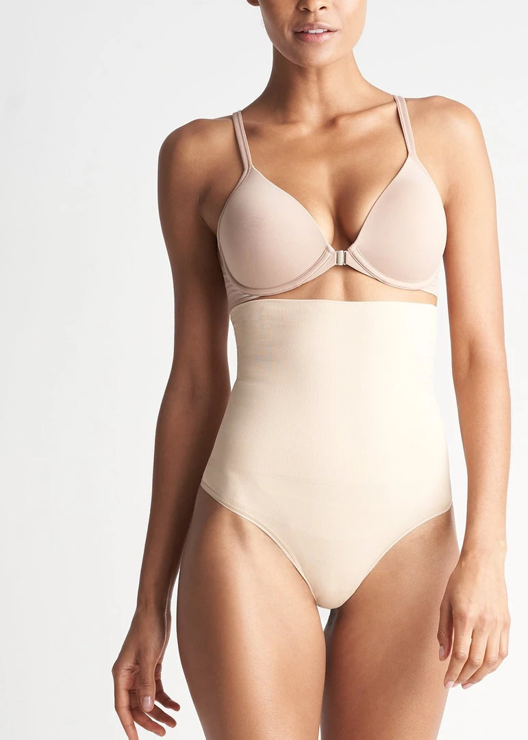 This high waist thong features cooling technology and targets your tummy with an extra wide shaping band.